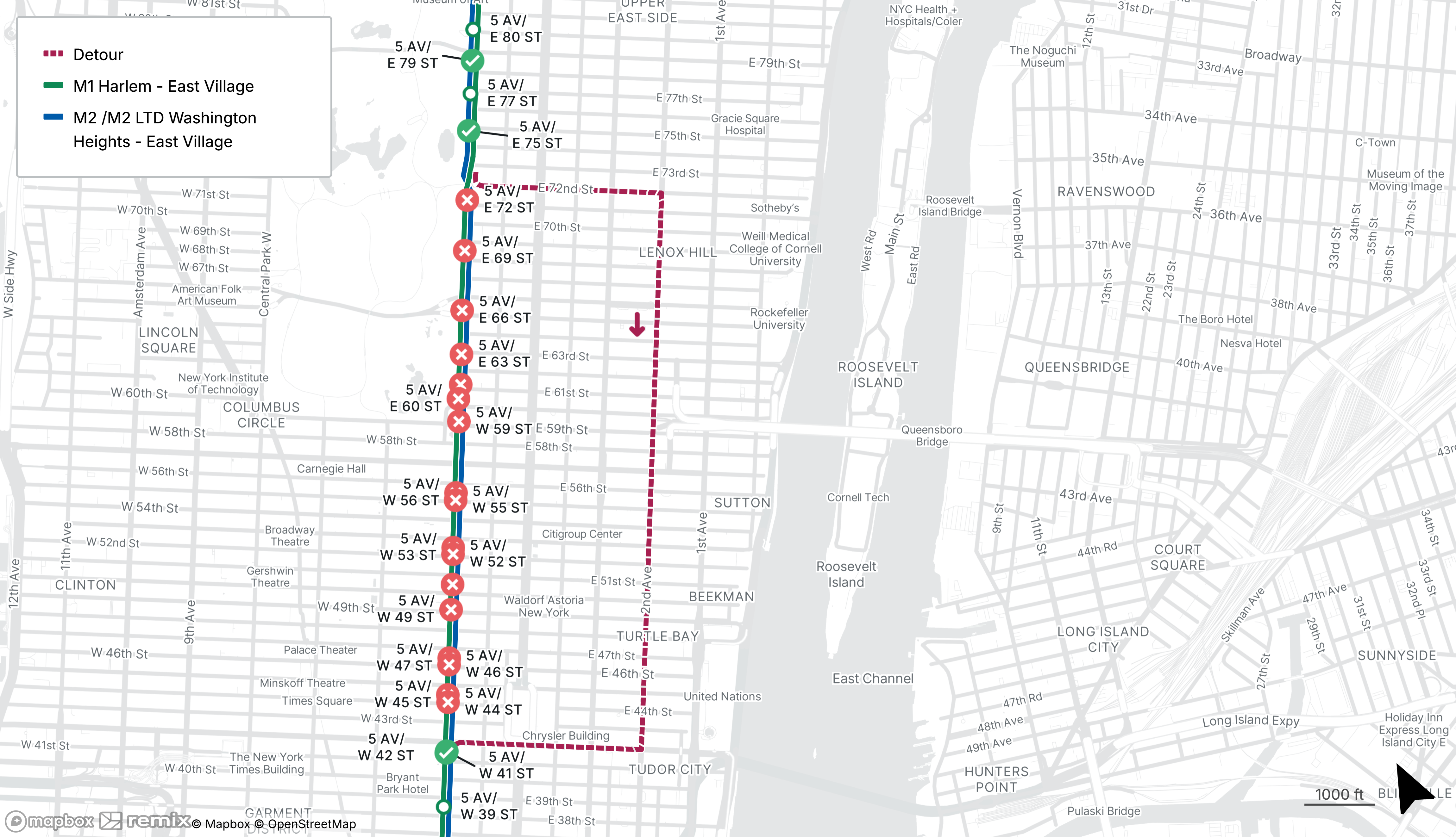 Boarding Change — Southbound M1 and M2 stops on 5th Ave from E 72nd St to W 44th St will be closed