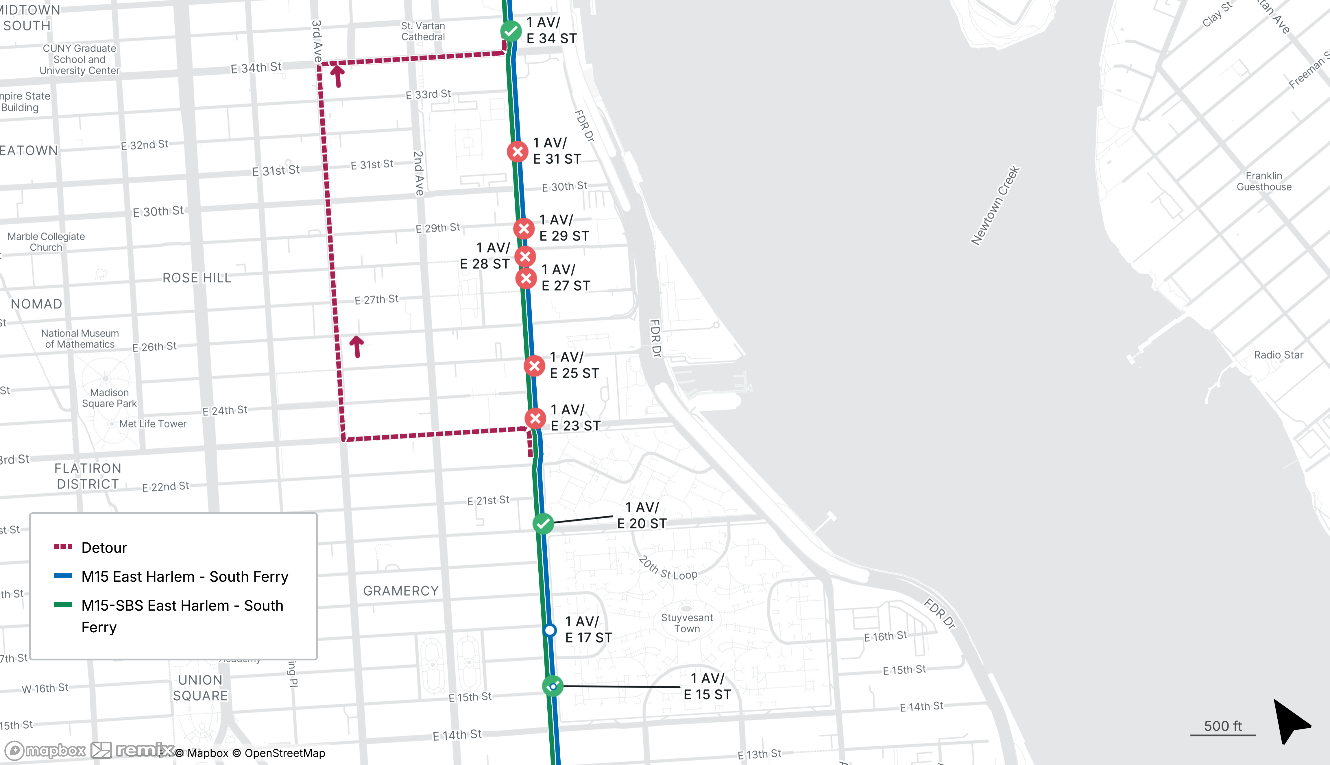 Boarding Change — Northbound M15 and M15-SBS stops on E 23rd St from 1st Ave to E 31st St will be closed