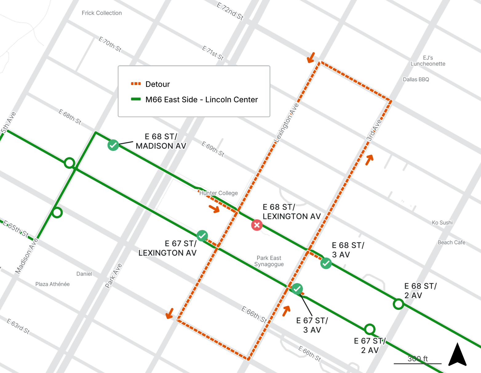 Planned - Detour — Eastbound M66 stop on E 68th St at Lexington Ave is closed; westbound buses are also detoured, but no stops are missed