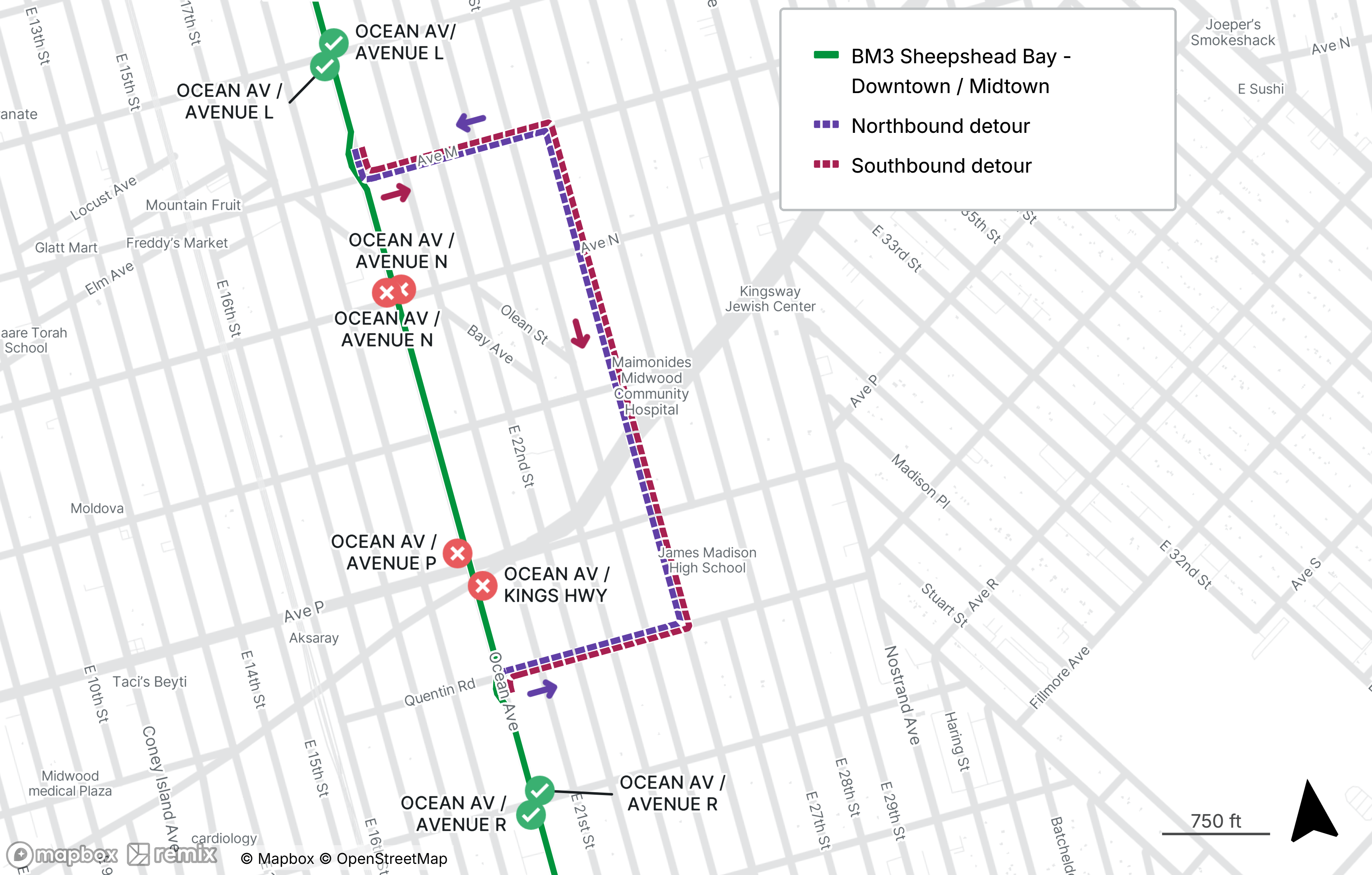 Boarding Change — BM3 buses will be detoured from Ocean Ave between Avenue M and Quentin Rd
