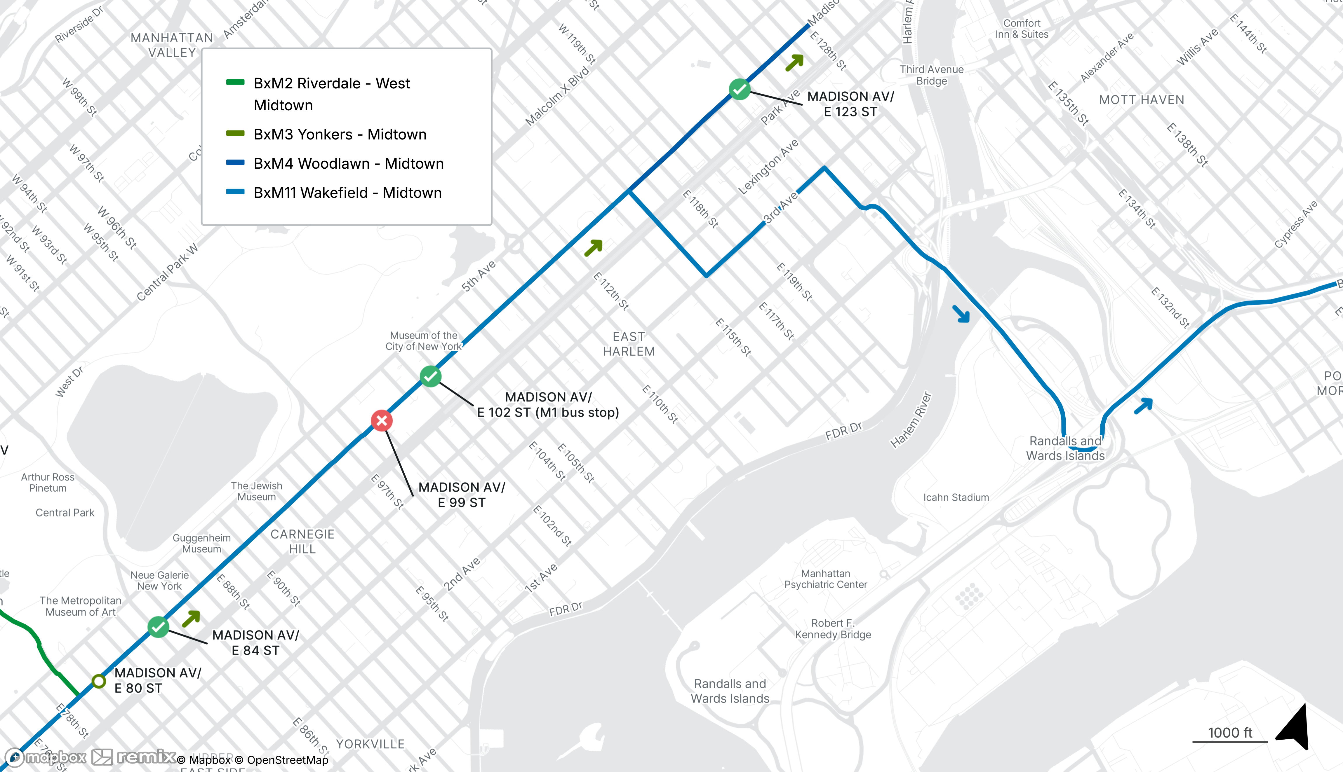 For BxM2, BxM3, and BxM4 service, use the stops on Madison Ave at E 84th St or 123rd St.